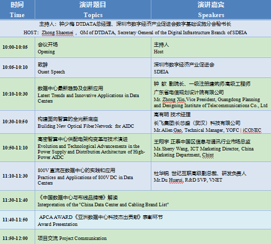 2025亚太云峰会-绿色数据中心创新论坛2025亚太云峰会-绿色数据中心创新论坛2025 APCA Summit Green Data Center innovation Forum 时间:2025年9月12日上午 Date: AM, September 12, 2025 地点:深圳国际会展中心11号馆会议区 Venue:Meeting Room, Hall 11, Shenzhen World Exhibition & Convention Center 会议主办:亚太云应用联盟、中国光博会、DTDATA Organizer: APCA, CIOE, DTDATA 协办单位:德事隆会议展览(广州)有限公司 co-organizer:DSL EVENT 支持单位:深圳市数字经济产业促进会 Supported by: SDEIA 2025年,我国算力产业迈向高质量、规模化发展的新阶段。截至今年6月底,我国在用算力中心标准机架达1085万架,智能算力规模达788EFLOPS,干线400G端口数量大幅增加至14060个,存力总规模超过1680EB,全国算力中心平均电能利用效率(PUE)降至1.42,算力基础设施规模和水平不断提升。未来,多元泛在、智能敏捷、安全可靠、绿色低碳的算力基础设施建设将持续加强,算力资源使用效率将进一步提升,并推动算力网络“点、链、网、面”体系化高质量发展。 9月12日,由亚太云应用联盟、中国光博会、DTDATA 联合主办,深圳市数字经济产业促进会支持的“2025亚太云峰会-绿色数据中心创新论坛”作为第26届中国国际光电博览会同期活动将如期在深圳国际会展中心(宝安)11号馆举办。论坛特别邀请数据中心行业专家、企业家及行业精英,围绕数据中心行业最新政策,算电一体化趋势,液冷、高压直流、算网融合等创新技术应用展开深入探讨,分享前沿的技术成果和成功案例。